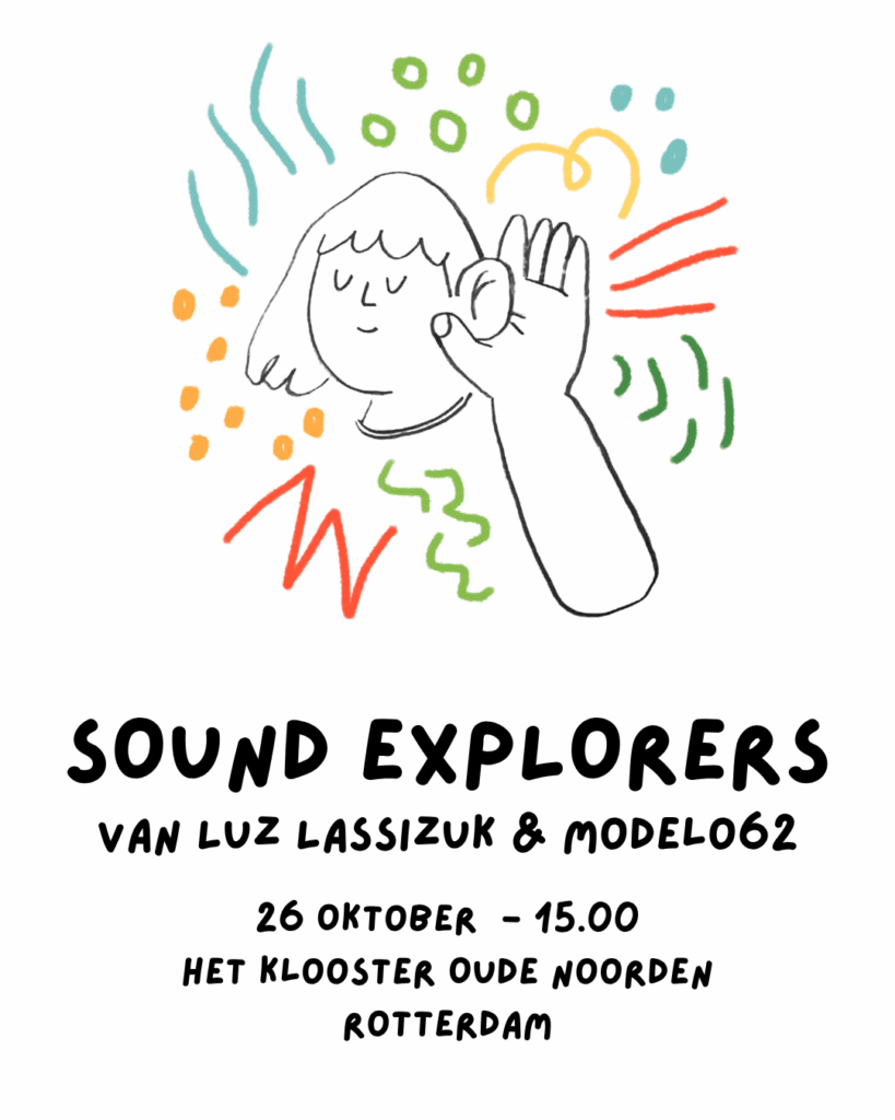 Hou je van speurtochten en avonturen? Ga dan mee op een geheime missie om geluiden te redden! Het Klooster Oude Noorden wordt een eiland waar je kan leren om een Sound Explorer te worden. Maar let op! Alleen als je nieuwsgierig genoeg bent, kun je meedoen aan de training. Tijdens de missie ga je op zoek naar bijvoorbeeld muziekstukken, een bijzondere geur of iets waar je zonder instrument muziek mee kan maken. Oh, en heb je weleens gehoord over stilte? Kun je dat eigenlijk horen? En wist je dat geluiden blij worden wanneer je naar ze luistert? Als je goed luistert, hoor je de muziek en je kunt zelfs meespelen met de musici van Modelo62. Ga mee op avontuur en misschien krijg je wel een bijzonder geluid mee naar huis!