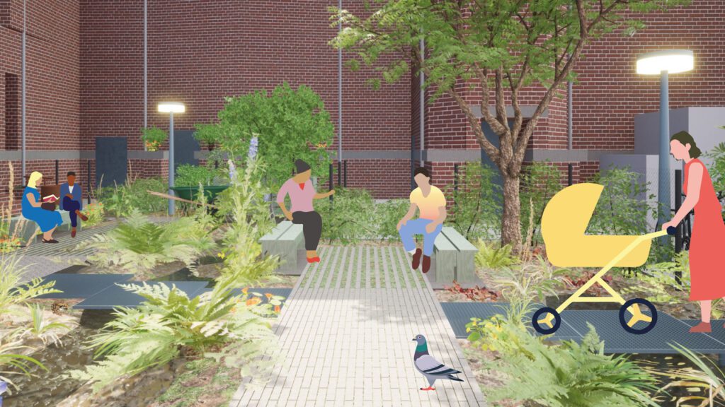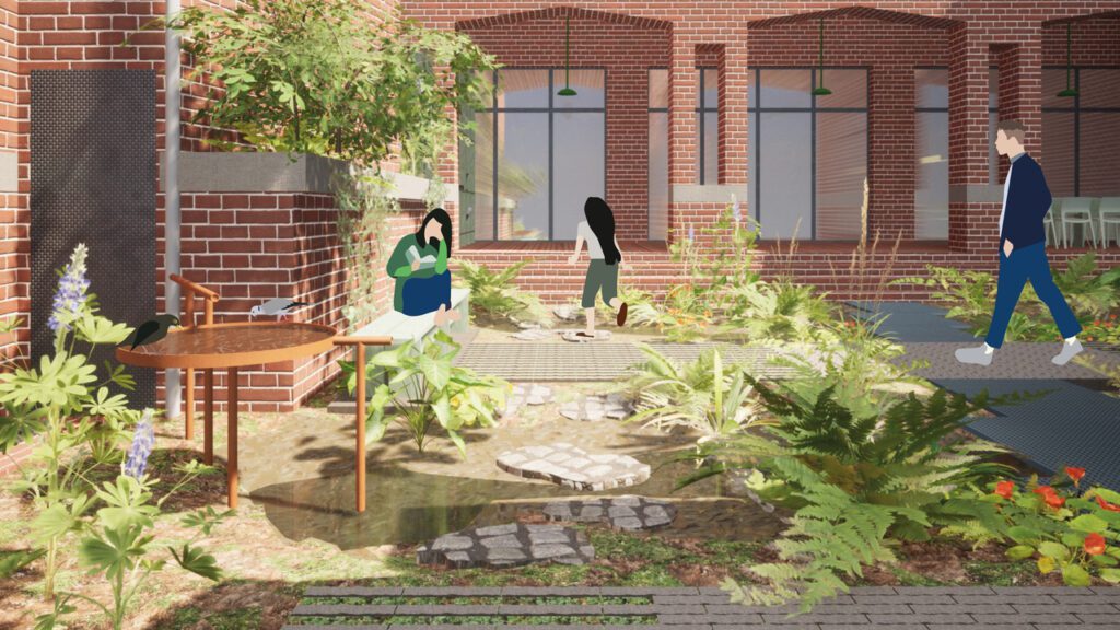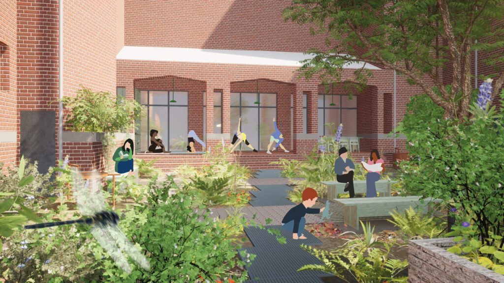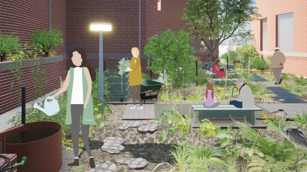 Er is ook een tweede binnentuin, verscholen tussen de muren aan de Hammerstraat. Deze tuin wordt in 2026 ontwikkeld tot de Kloostertuin: een klimaattuin waar planten de ruimte krijgen en je tot rust kan komen tussen het groen. Dit doen we met Het Klooster Oude Noorden, ontwerpbureau Aanpact, Rotterdams Weerwoord, en heel belangrijk….. met jou!